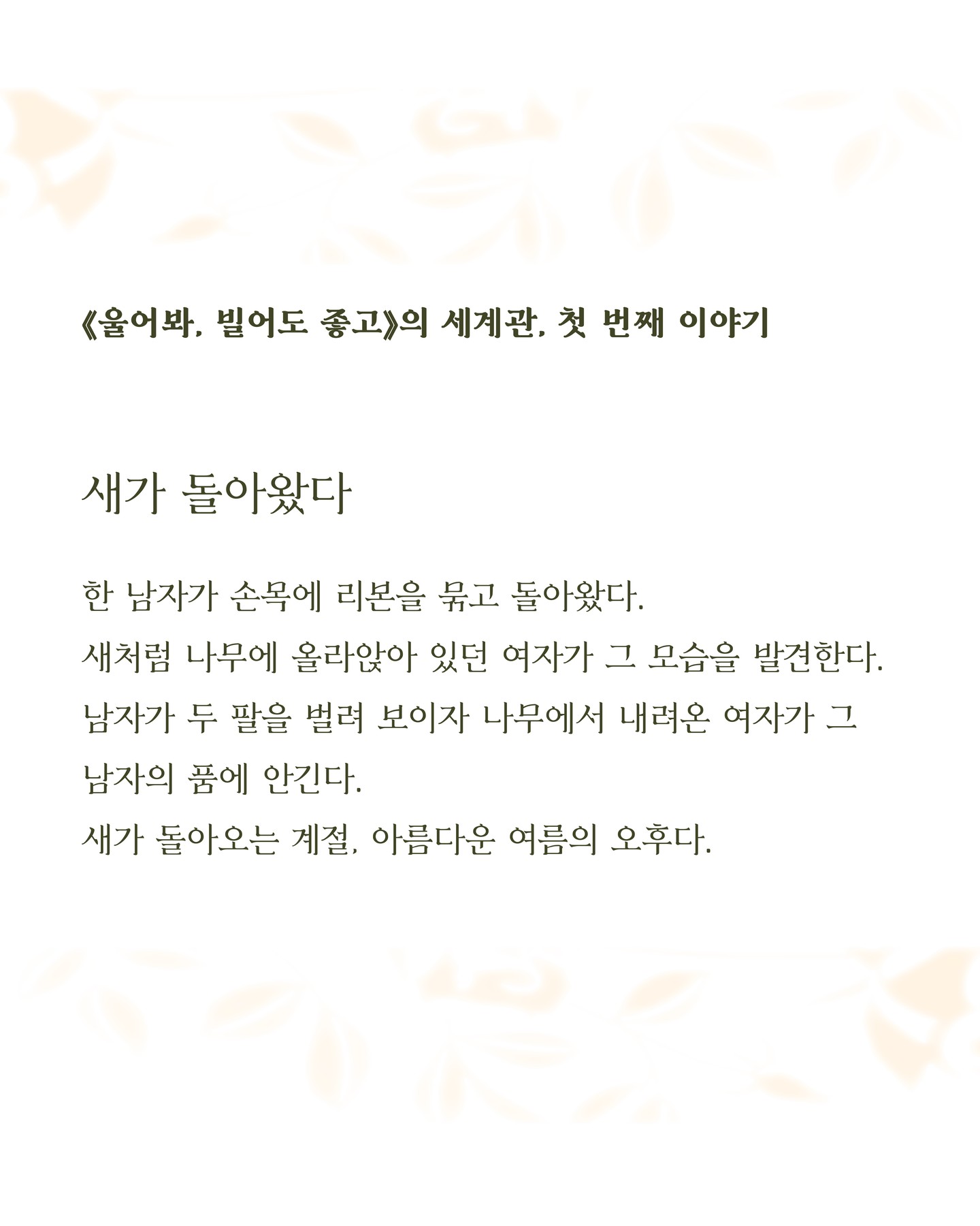 상상을 거듭하다 보니 이 장면 속 두 사람의 이야기가 궁금해졌습니다. 그리고 가장 먼저 ‘새가 돌아왔다’라는 문장을 썼습니다. 결말을 정해두고, 역순으로 그 결말을 향해 가는 과정을 만들어간 셈입니다.