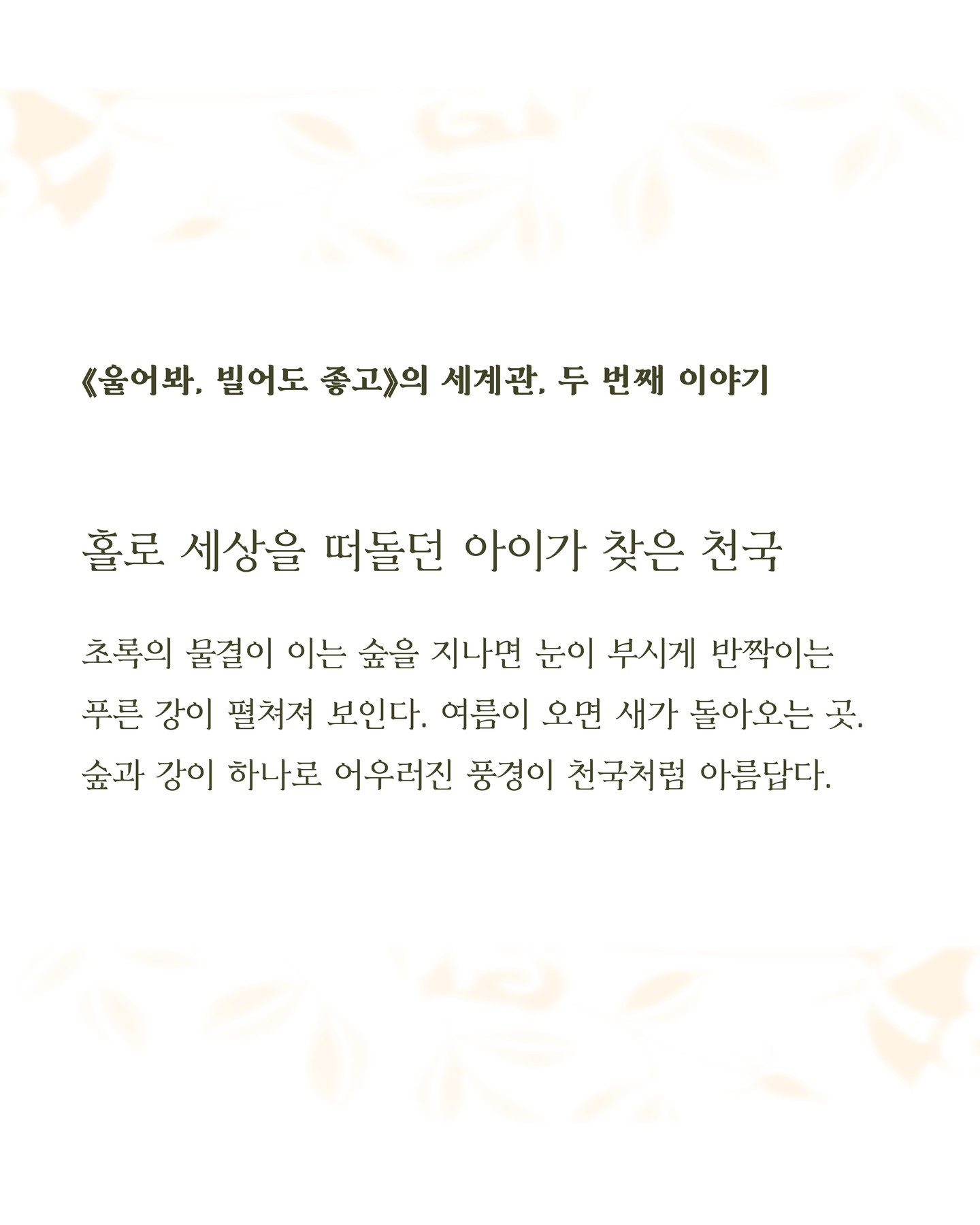 (…) 아르비스의 숲은 그런 바람을 담아 열여덟의 레일라 르웰린을 축복했다. 아름다운 초록의 물결과 새들의 노래로, 자전거를 타고 플라타너스 길을 달리는 아이를 감싸안으며. 간신히 지켜낸 아이의 성역을 집어삼킬 물살의 흐름은 까맣게 모르는 채로.