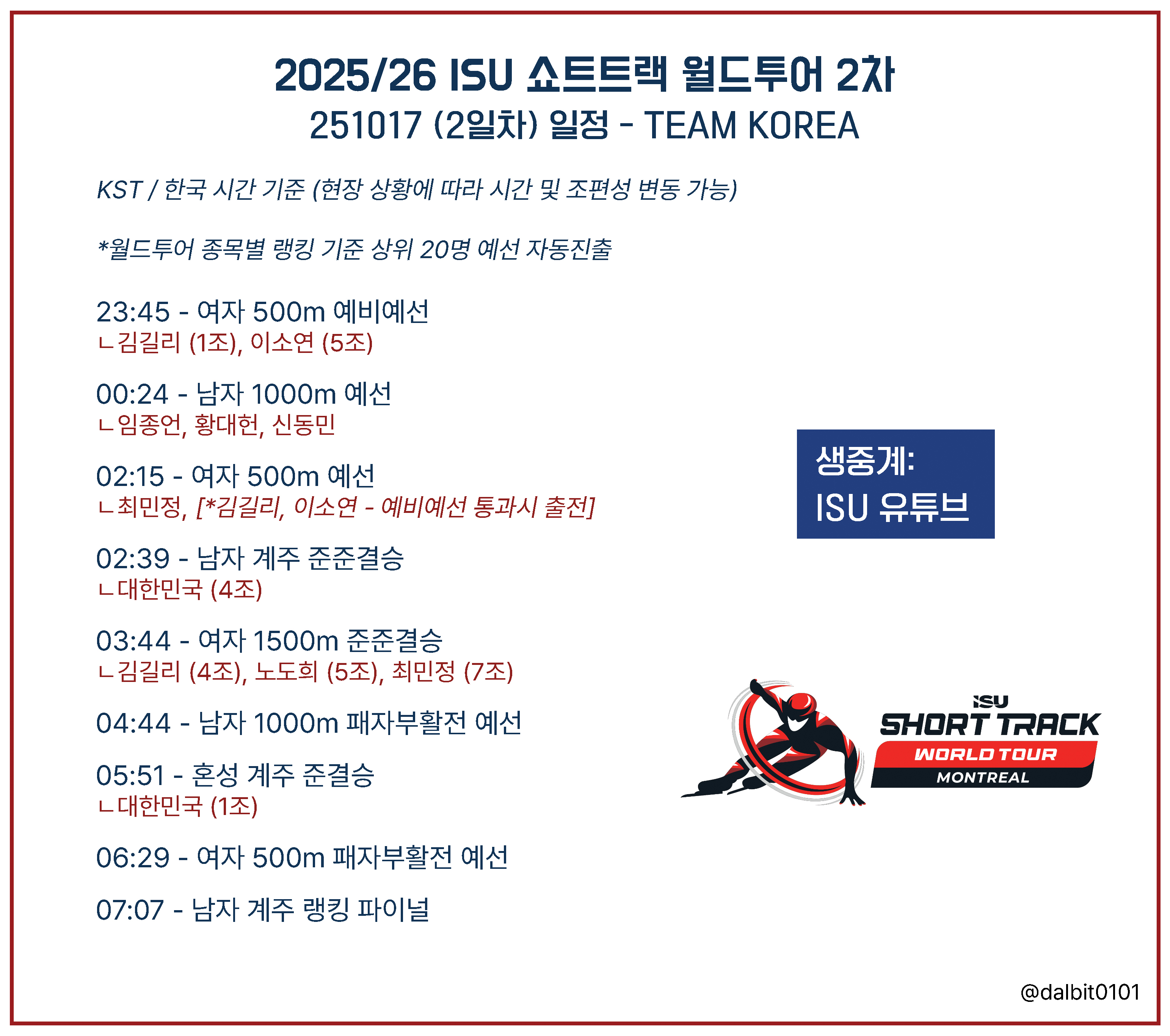 25/26 쇼트트랙 월드투어 4차 2일차 일정