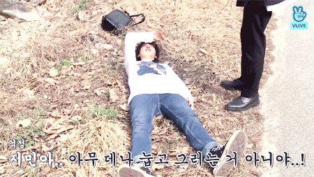 지민이가 길에 눕고 진이형이 폴라로이드 찍어줌