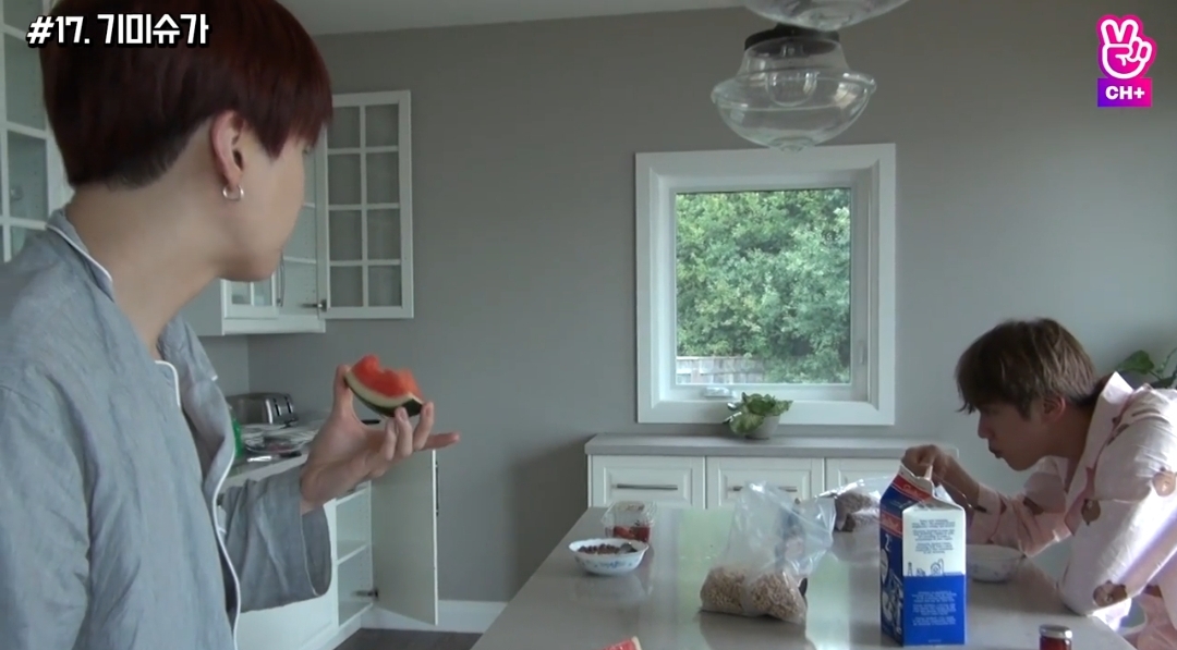 시리얼 퍼묵퍼묵하면서 수박 써는 형아들