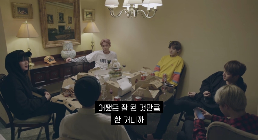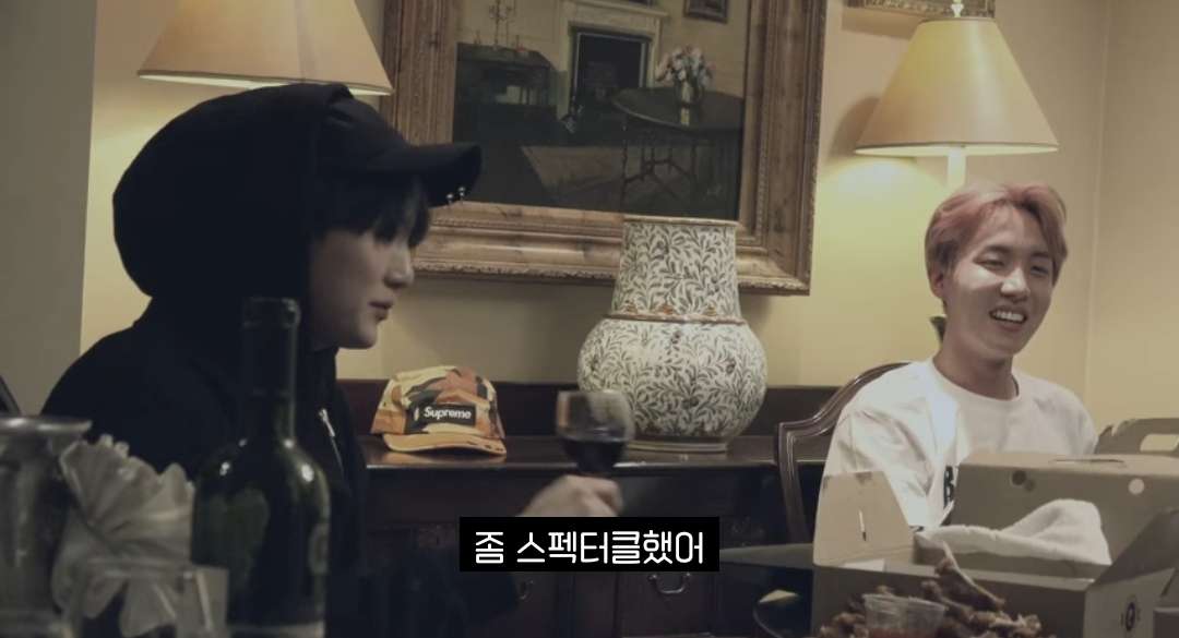 연말에 혼자 숙소에 있는 제이홉 심심하다니까 일찌감치 숙소로 치킨 사들고 돌아온 슈가