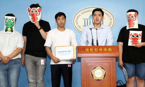 | 23일 오전 서울 여의도 국회 정론관에서 공정사회를 위한 대학생모임 회원들이 조국-조민 부녀에 대한 직권남용죄, 뇌물죄, 업무방해죄, 위계에 의한 업무방해죄 등으로 고발기자회견을 하고 있다. 연합뉴스 |