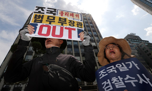 | 23일 오전 조국 법무부 장관 후보자의 인사청문회 준비 사무실이 있는 서울 종로구 적선현대빌딩 앞에서 열린 조 후보자 사퇴 촉구 기자회견에서 참가자들이 피켓을 들고 구호를 외치고 있다. 연합뉴스 |