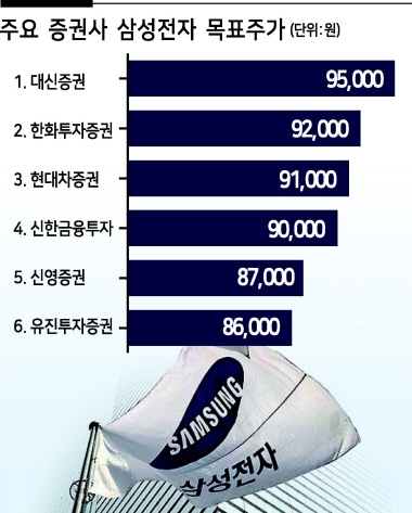 대신증권은 최근 목표주가를 9만5000원으로 올리며 ‘10만전자’ 가능성을 제시했고, 한화투자증권(9만2000원), 현대차증권(9만1000원), 신한금융투자(9만원) 역시 연이어 9만원 이상의 목표주가를 제시했다. 이순학 한화투자증권 연구원은 “삼성전자의 4분기 실적은 매출 59조1000억원, 영업이익 9조3000억원으로 전망치를 약 5.5% 하회할 것 같지만, 메모리업황에 가격 반등 신호가 있어 이를 주시해야 한다”며 “오히려 내년 실적은 높아질 것으로 기대하고 있다”고 분석했다.