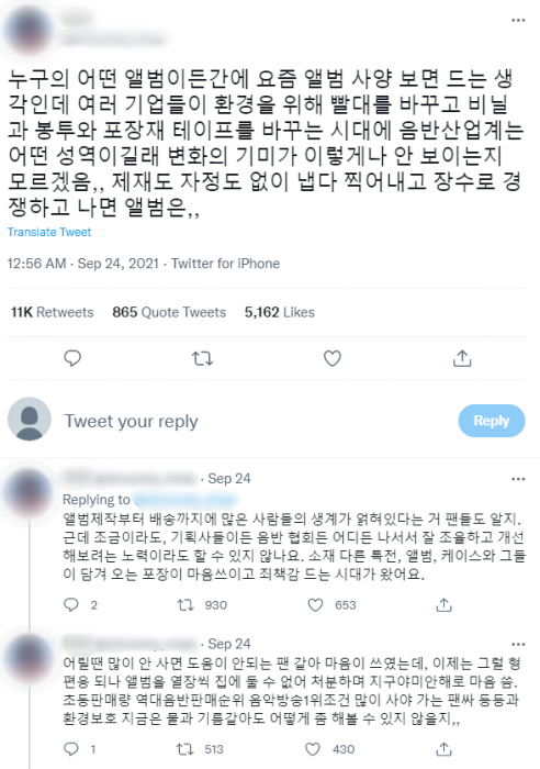 이같은 비난에 음반업계에서도 변화의 움직임이 일고 있다. 지난 2월 발매된 청하의 정규 1집 '케렌시아(Querencia)' 앨범은 포토카드 외에는 친환경 종이를 사용하고 비닐코팅은 최소화했다. CD 역시 고정되는 플라스틱 없이 종이봉투에 담았다.