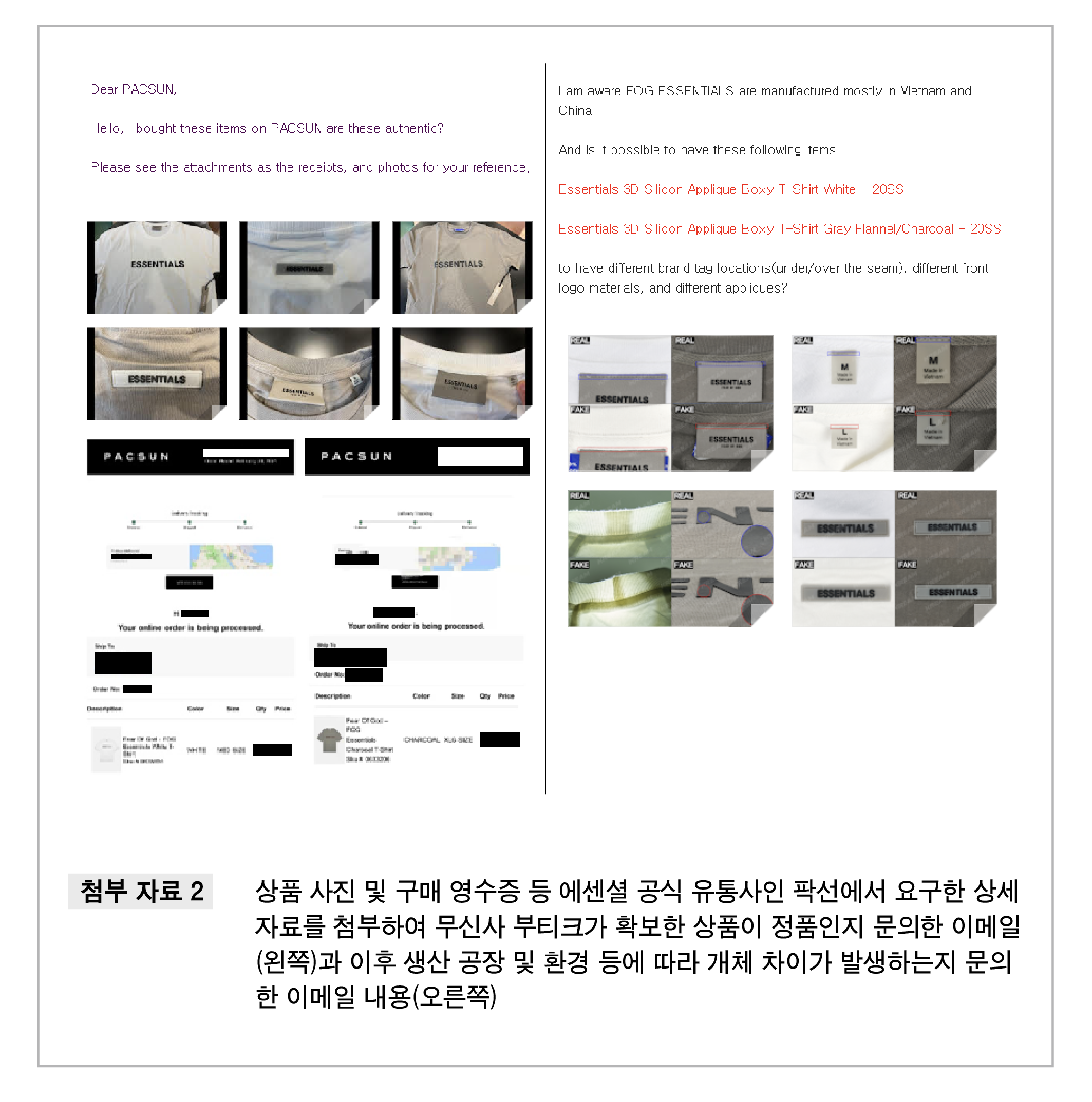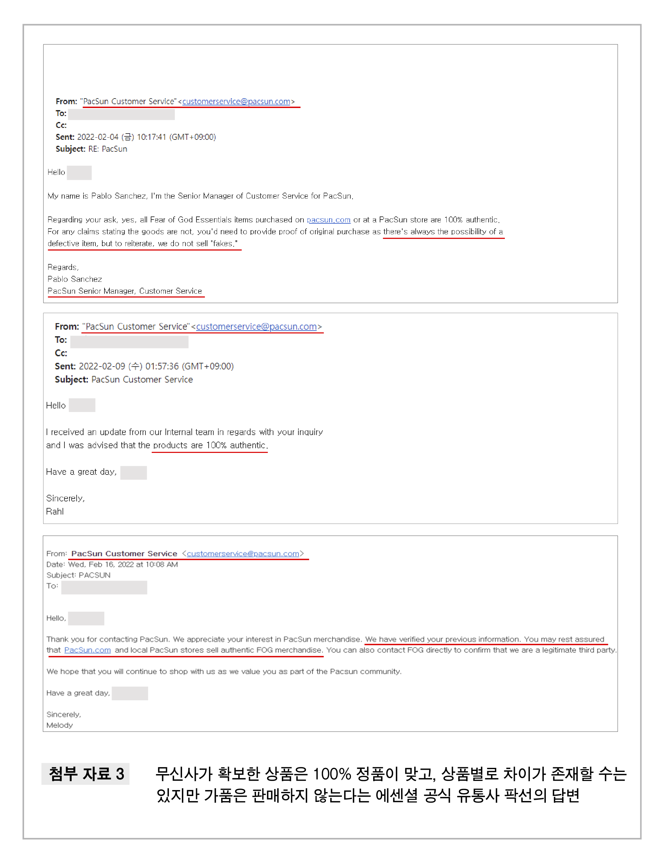 네이버 크림이 제기한 에센셜 가품 판정 포인트가 합리적이고 타당한지에 대해서도 팍선(PACSUN) 측에 직접 문의하였습니다. 팍선 고객센터는 생산 과정에서 네이버 크림이 지적한 개체 차이가 발생할 수 있으며, 팍선은 에센셜의 공식 유통사(a legitimate third party)로서 가품을 판매하지 않는다고 확답하였습니다.