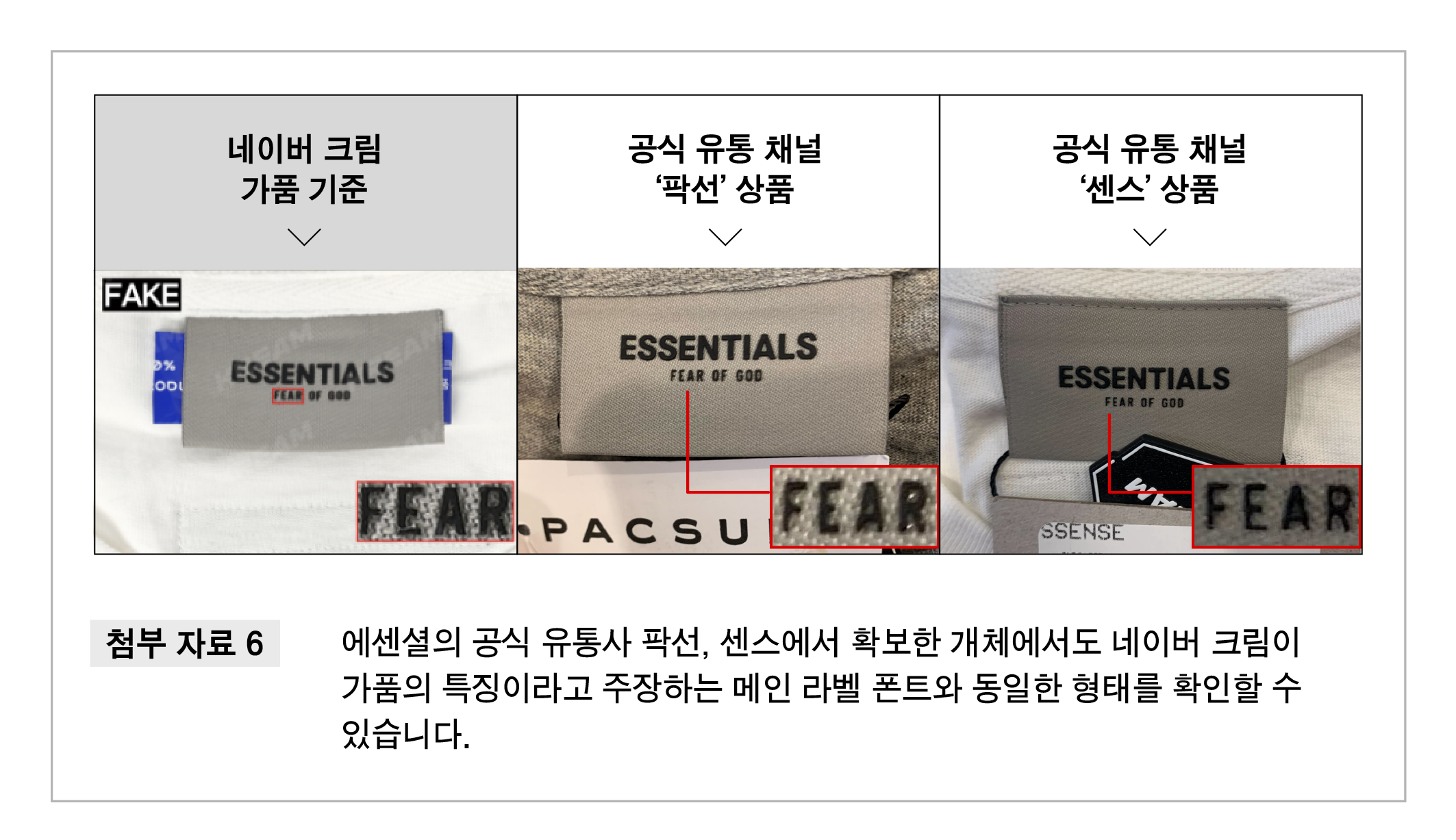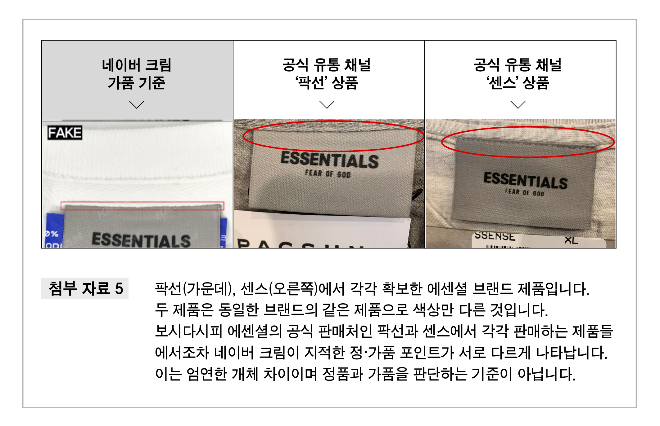 그 결과, 무신사 부티크가 팍선(PACSUN), 센스(SSENSE), 미스터포터(MR PORTER)와 같은 에센셜 브랜드의 글로벌 공식 판매처에서 공급받은 100% 정품에서도 네이버 크림 측이 ‘정·가품’ 판정 포인트라 주장하는 개체 차이가 확인되었습니다.