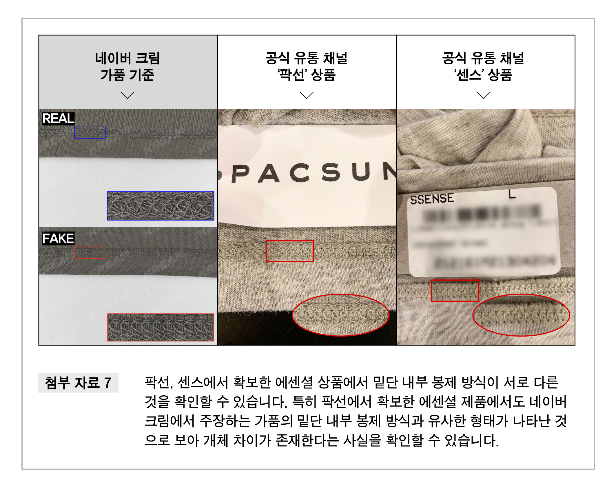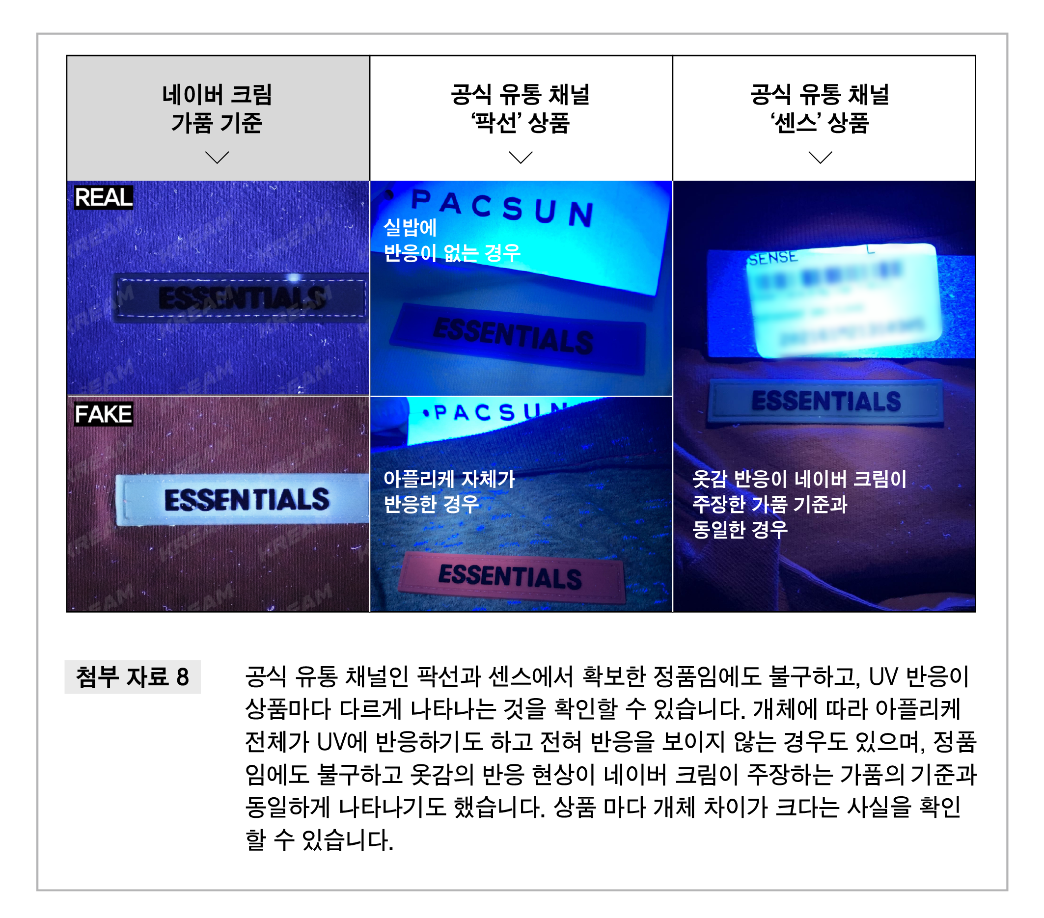 그 밖에 네이버 크림이 정품과 가품의 차이로 주장한 ‘밑단 내부 봉제 방식’이나 ‘후면 아플리케 및 원단 UV 반응’ 등과 같은 기준의 경우에도, 에센셜의 공식 유통사에서 확보한 제품 사이에서 상이한 형태를 확인할 수 있었습니다. 이는 상품 마다 개체 차이가 있다는 것을 보여주는 것입니다.