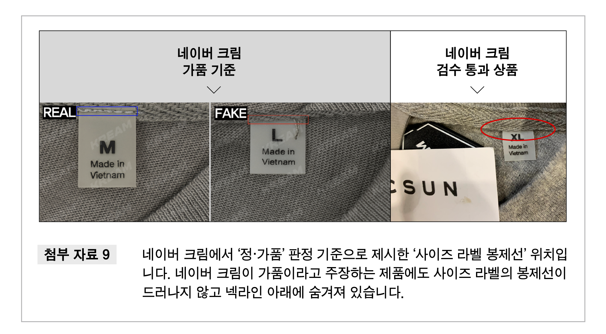 아울러 네이버 크림이 정품으로 검수한 개체들 사이에서조차 자신들이 기준으로 내세운 정·가품 포인트가 서로 다르게 나타나기도 했습니다. 사이즈 라벨 봉제선에 대해서 정품은 라벨 위로 드러나는 반면 가품은 라벨 속에 감춰져 있다고 주장했지만, 검수를 통과한 상품 중에는 라벨이 위로 드러나거나 감춰있는 제품이 모두 존재했습니다.