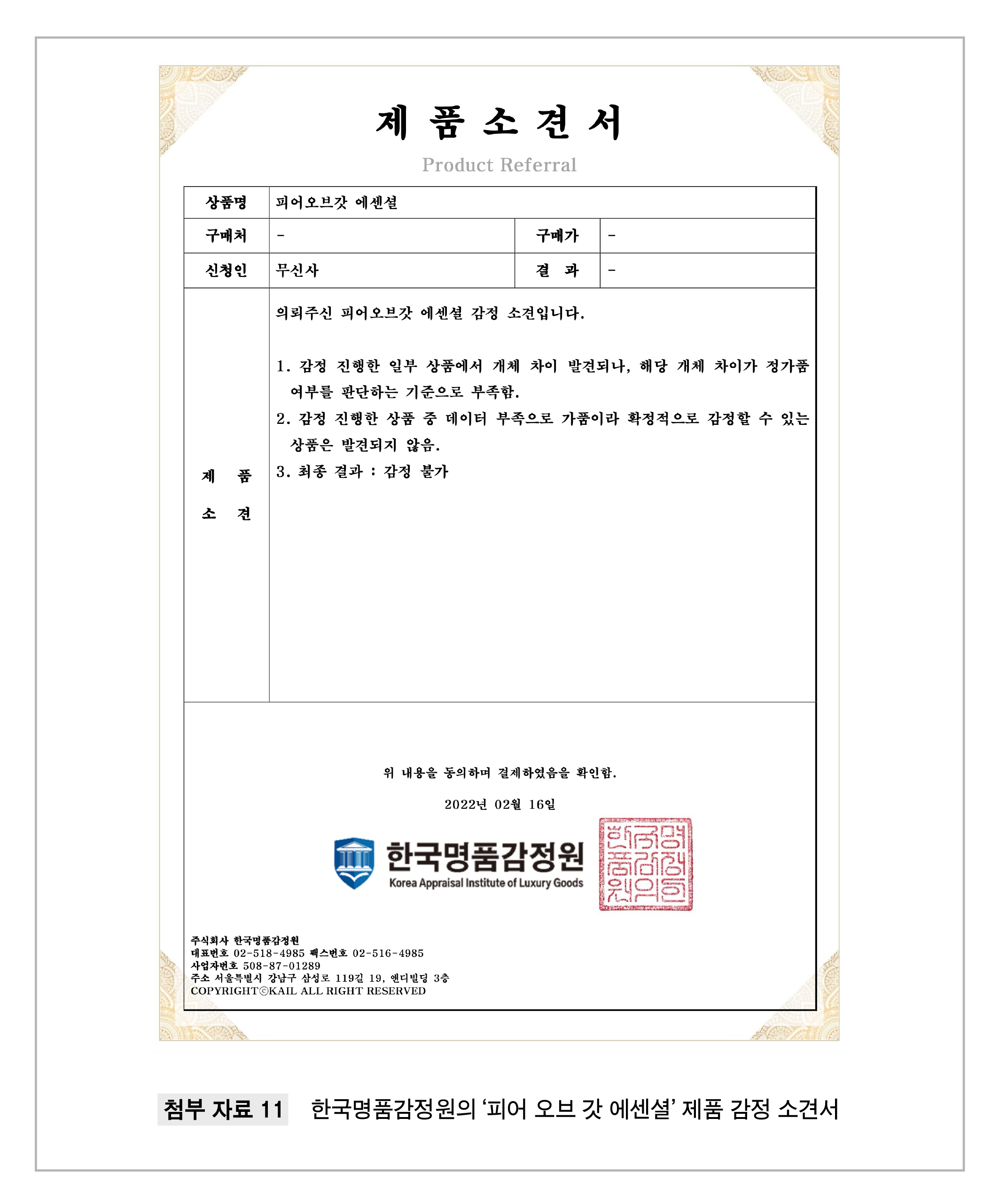 추가로 국내외 전문 기관에 상품의 정품 감정을 의뢰하였습니다. 한국명품감정원은 해당 에센셜 상품에서 개체 차이가 발견되지만, 이러한 개체 차이가 가품으로 판정하는 기준이 될 수 없다고 답변하였습니다. 글로벌 명품 감정 서비스 레짓 체크(Legit Check by Ch)는 해당 상품은 100% 정품이라는 최종 감정 결과를 전했습니다.