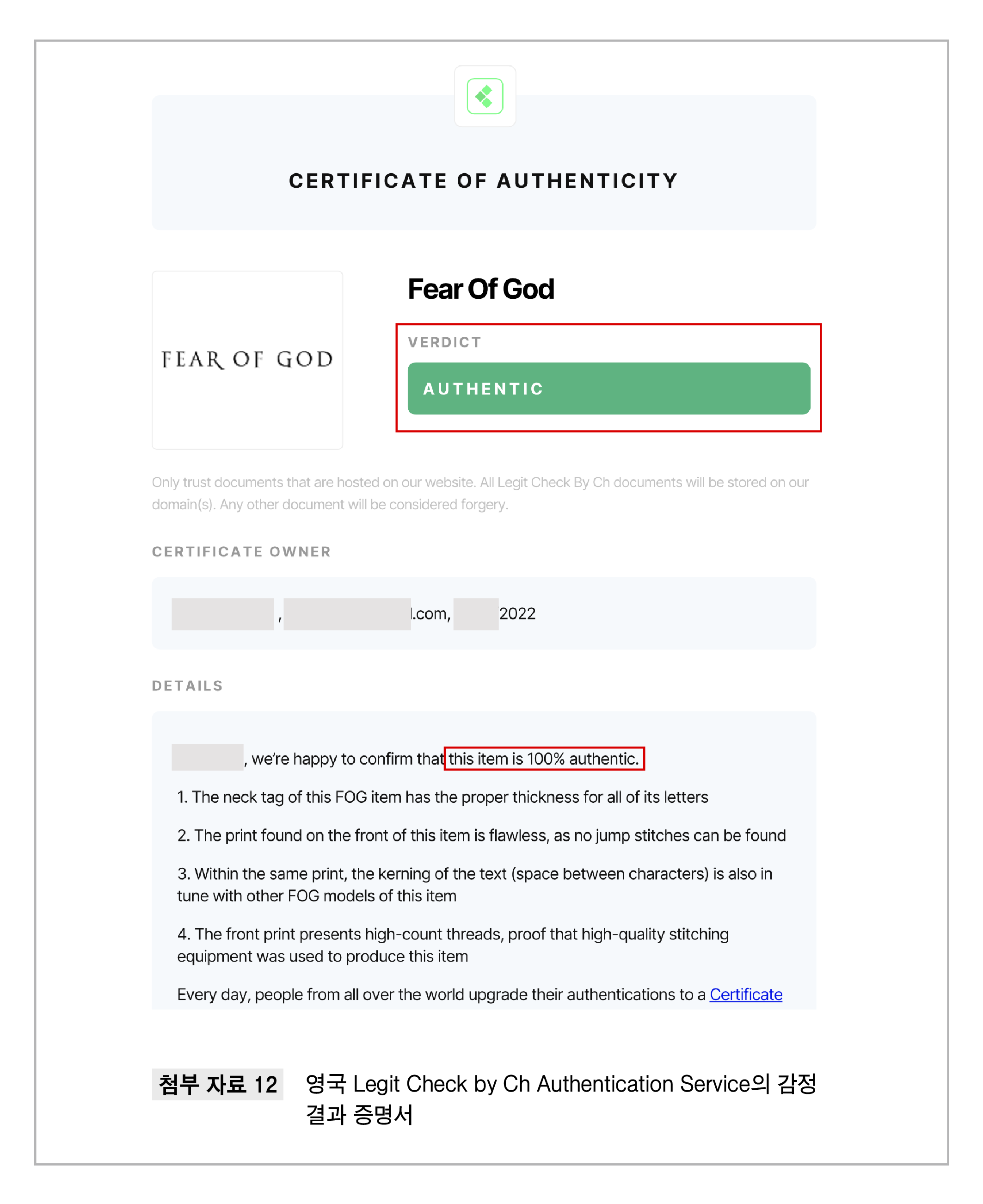 3. 추가로 국내외 전문 기관에 상품의 정품 감정을 의뢰하였습니다. 한국명품감정원은 해당 에센셜 상품에서 개체 차이가 발견되지만, 이러한 개체 차이가 가품으로 판정하는 기준이 될 수 없다고 답변하였습니다. 글로벌 명품 감정 서비스 레짓 체크(Legit Check by Ch)는 해당 상품은 100% 정품이라는 최종 감정 결과를 전했습니다.