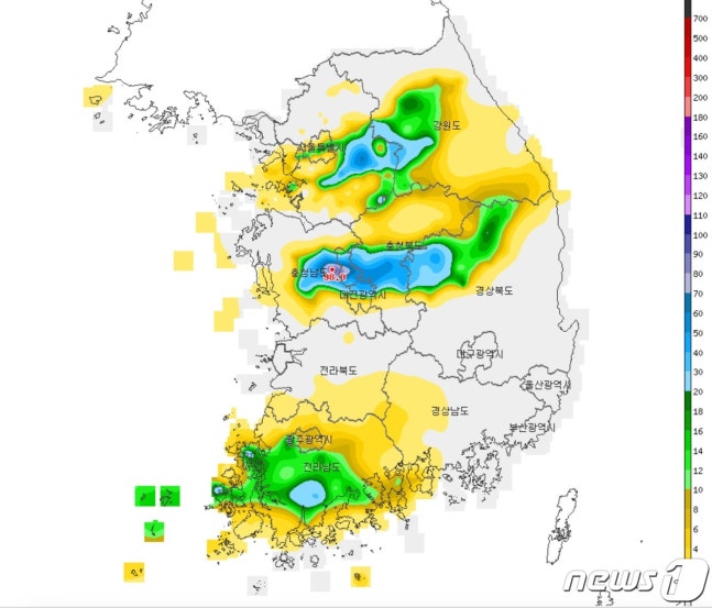 충청권에는 세종 78.5㎜, 청주 청남대 57.5㎜, 대전 45.0㎜ 등 비가 내렸다. 이 밖에는 양평 57.0㎜, 문경 50.9㎜, 광주(오포) 50.0㎜ 등 서쪽 지역을 중심으로 50㎜ 넘게 비가 오는 곳이 많았다.