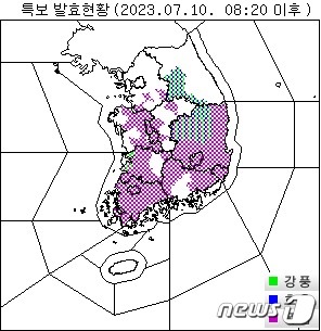(서울=뉴스1) 황덕현 기후환경전문기자 = 정체전선에 따른 저기압 영향으로 월요일인 10일 출근길 수도권 등 중부 지방과 충청, 전라 지역에 강수가 집중되고 있다. 밤사이 벌써 100㎜에 육박하는 비가 내린 지역도 있다. 좁은 지역에 강하게 내리는 비는 이번 주 내내 이어질 전망이다.