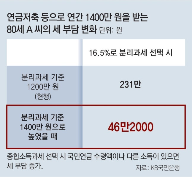 실제로 분리과세 기준이 20%가량 높아지면 연 1400만 원의 사적연금을 수령 중인 80세 노년층의 경우 내야 하는 세금이 최대 185만 원 줄어들 것으로 보인다. 현재 다른 소득이 있어서 분리과세를 선택하면 최대 231만 원의 세금을 내야 했다. 하지만 저율 분리과세가 적용되면서 납세액이 46만2000원으로 감소하는 것이다.