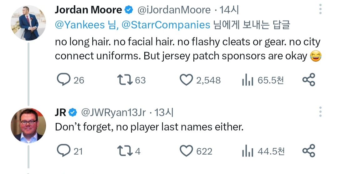장발ㄴ 턱수염ㄴ 화려한 장비 ㄴ 등등 메이저리그 팀 중에서 복장과 외모 규정이 가장 엄격할 정도로 전통을 중시하는 팀이 상업적인 광고패치는 허용하는게 웃기다라는게 있음