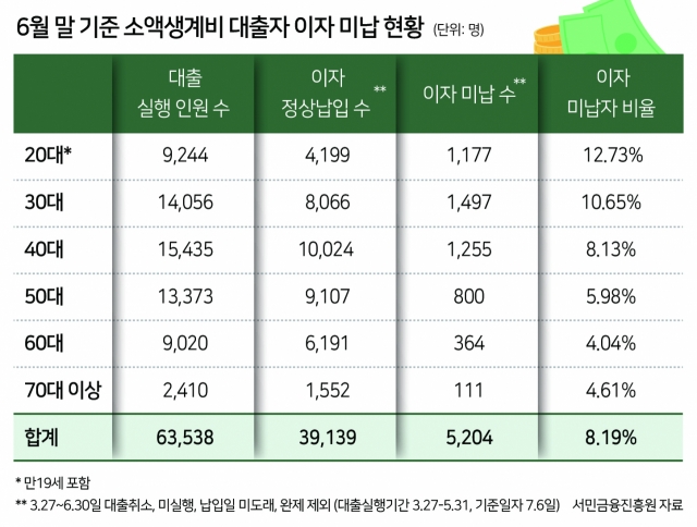 14일 금융권에 따르면 소액생계비 대출은 6월 말 기준 모두 6만3538명이 총 390억원을 대출 받았다. 이자를 제 때 내지 못하고 있는 이들은 이 중 8%에 해당하는 5204명(대출취소, 미실행, 납일일 미도래, 완제 등 제외)으로 집계됐다.