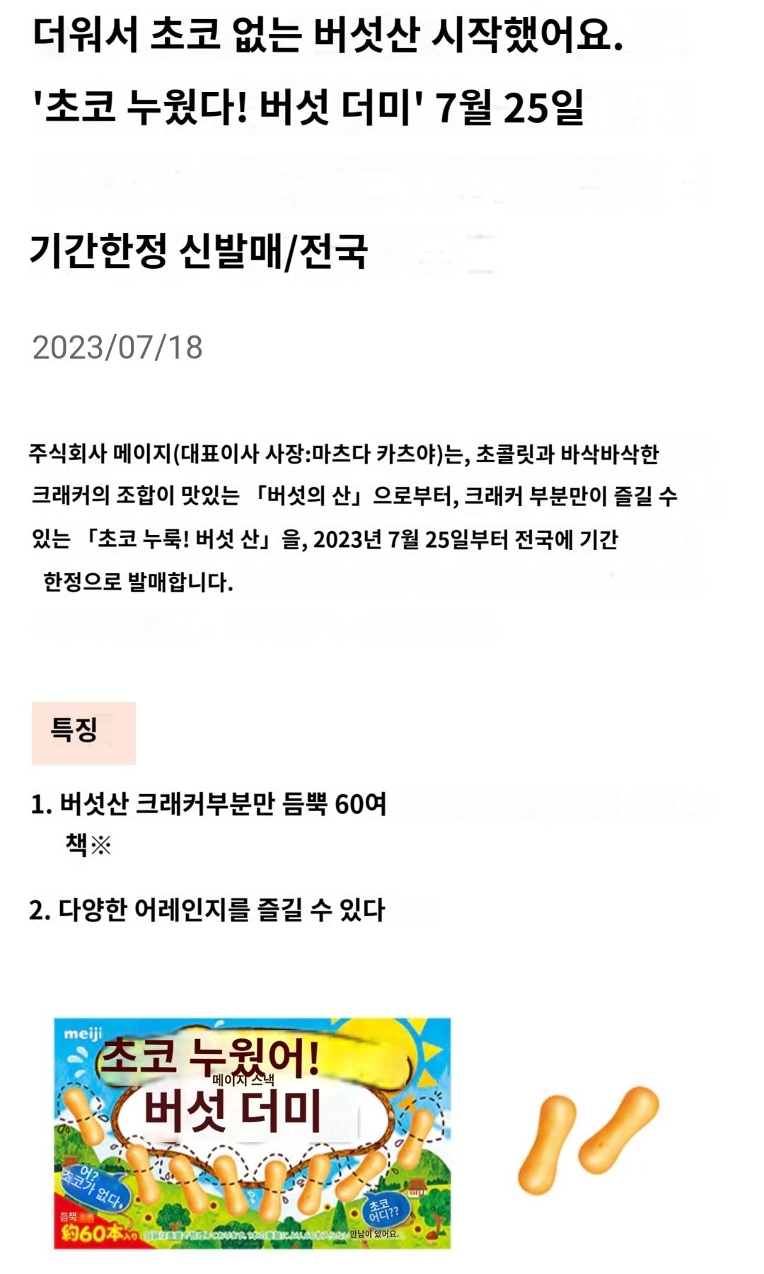 메이지는 18일, 스테디셀러 초콜릿 과자 「버섯의 산」의 초콜릿 부분이 없는 신상품을 발매한다고 발표했다. 25일부터 여름 한정 상품으로서 전국에서 발매한다.「초콜릿 과자의 수요가 시들해지는 여름에도, 버섯의 산을 즐겨 주었으면 한다」(동사)라는 발상으로부터 상품화가 결정되었다.