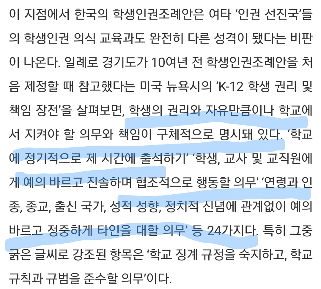 그에비해 한국의 특히 서울의 학생인권조례는 위와 다르게 자세한 구체적인 규범이 아닌 뭉뚱그려 타인의 인권을 존중해야한다 이런말뿐이고 오히려