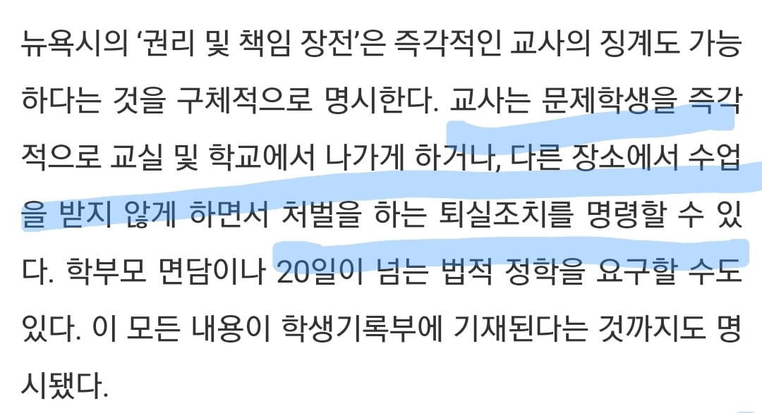 근데 우리나라는 그게 없고 오히려 교사의 비육체적 훈육 수단(반성문 교실에서 내보내기 벌점)등등 역시 막는 조항들뿐임