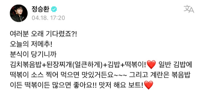맨날 팬들한테 음식 메뉴랑 조합 추천해 주는 건 기본이고