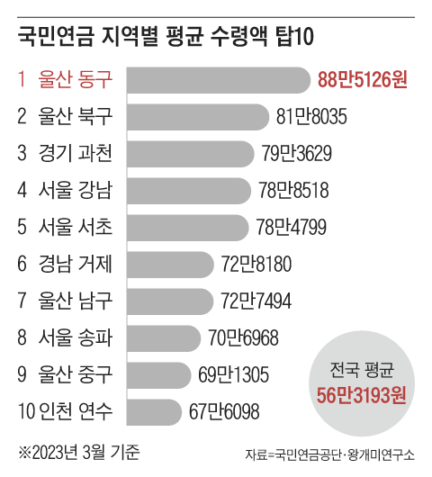 전국 지자체 중 국민연금 수령액 상위 10위권에는 울산·거제 등 고소득 일자리 도시가 많았다. 특히 울산은 1·2·7·9위를 싹쓸이해 압도적인 우세를 보였다. 서울은 강남 3구(강남·서초·송파)만 톱 10에 이름을 올리며 체면을 지켰다.