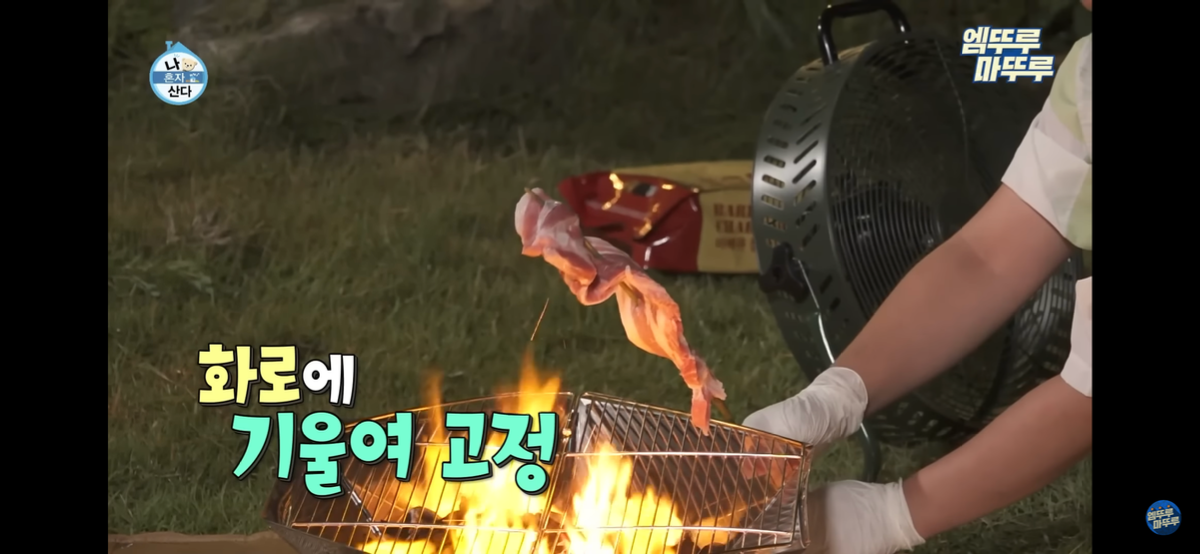 통삼겹살 뚫어서 화로 위에 안착