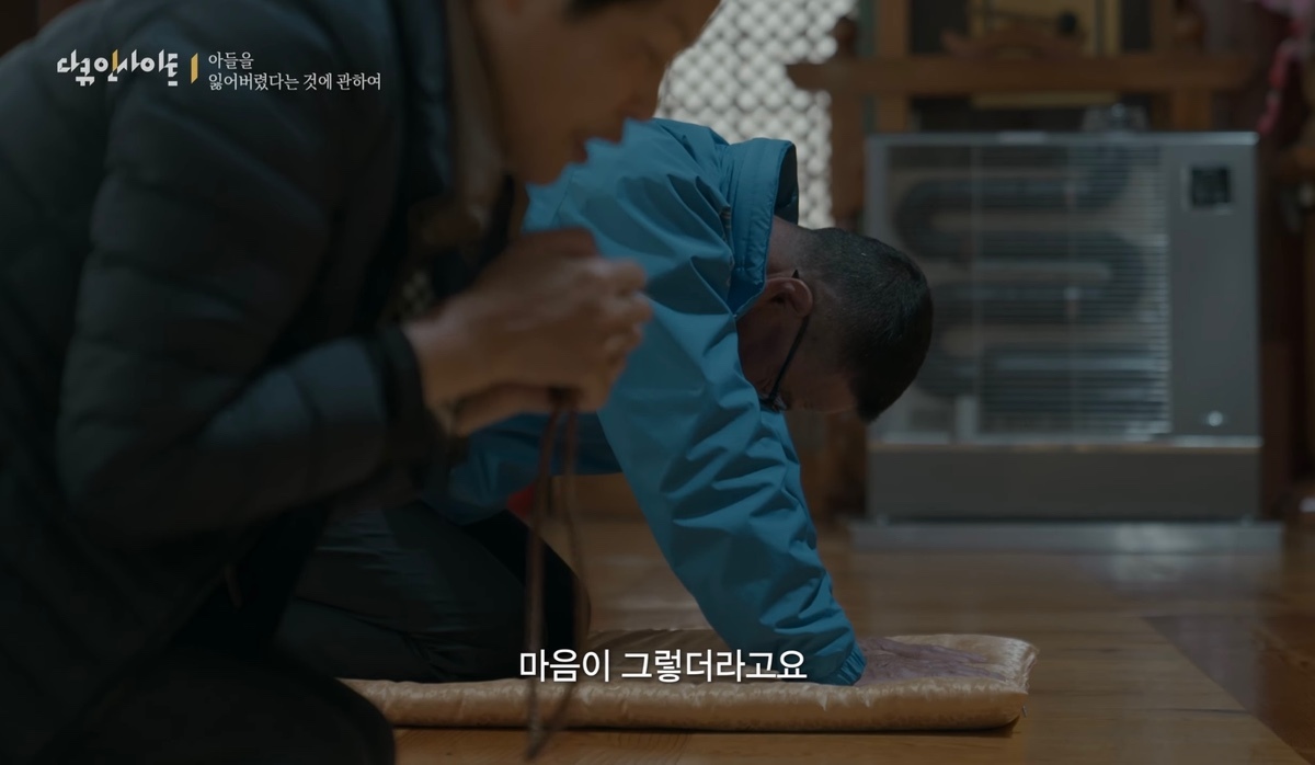 눈물을 흘리며 절을 하고 기도하는 부부