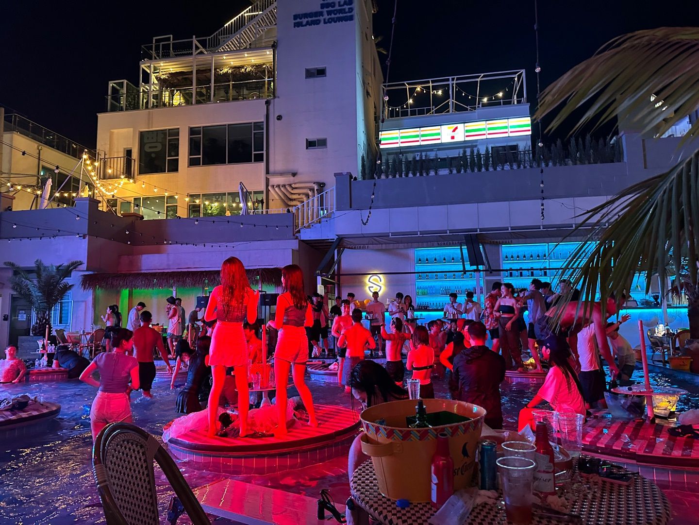 손목에 띠를 착용하고 입장하니 큰 수영장 두 개가 한가운데 있다. 그 주변으로는 테이블 좌석이 둘러싸고 있다. 무대를 감싼 테이블, 강남 나이트클럽을 수영장으로 옮겨 놓은 듯하다. 물속에서 더 재미있게 놀 수 있게 직원들은 물총과 비치볼을 나눠준다. 순간 파티장은 서로 물총을 쏘는 ‘워터밤’ 공연장이 됐다. 열기가 절정으로 치솟았을 때쯤 “뿌우!”소리와 함께 비누 거품 폭탄이 발사된다. “꺄아!” 소리를 지르며 환호하는 사람들. 비누 거품 하나에 행복해하는 이들이 젊음이다.