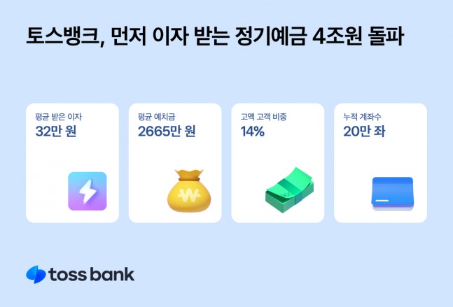 토스뱅크는 '먼저 이자 받는 정기예금'이 출시 170일만에 예치액 4조원을 돌파했다고 13일 밝혔다.