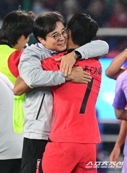 7일 오후 중국 항저우 황룽스포츠센터스타디움에서 대한민국 축구대표팀과 일본의 항저우아시안게임 남자축구 결승전이 열렸다. 축구대표팀이 일본에 2-1 승리하며 금메달을 차지했다. 정우영과 포옹을 나누고 있는 황선홍 감독. 항저우(중국)=송정헌 기자songs@sportschosun.com/2023.10.07/