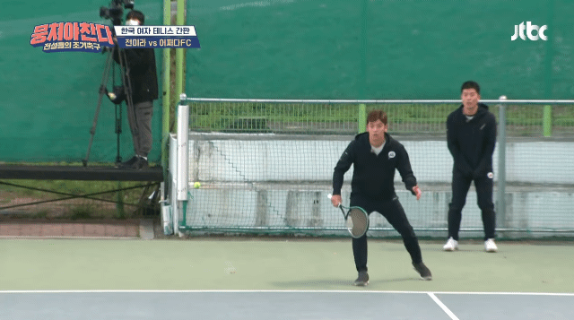 실수로 갑자기 날라오는 테니스공을 대처하는 이대호와 안정환.gif