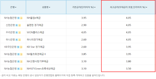 금융권과 은행연합회에 따르면 16일 기준으로 신한·하나·우리·NH농협은행 등 4개 은행의 정기예금 금리는 최고 연 4.05%를 기록했다.