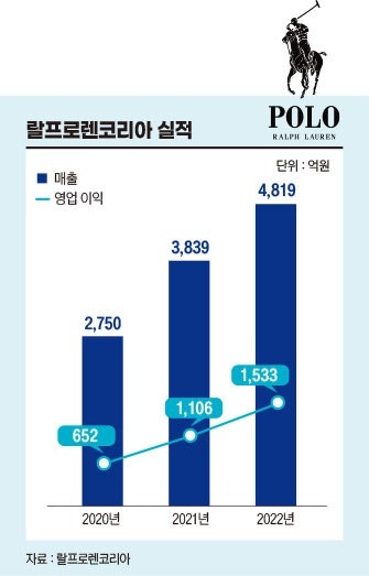 한국 사업 분위기는 더 좋다. 랄프로렌 코리아의 지난해 매출은 4819억원, 영업이익은 1533억원이다. 매출은 전년 대비 25.5%, 영업이익은 38.6% 늘었다. 2020년과 비교하면 매출과 영업이익은 각각 75.2%, 135.1% 급증했다.