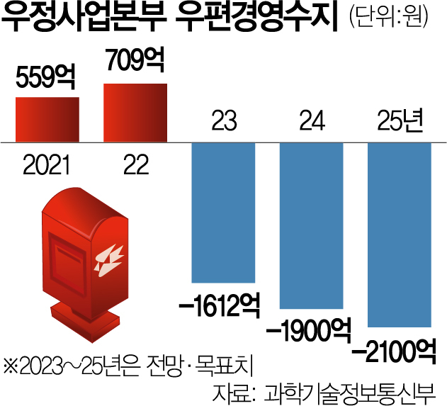 24일 우본 등에 따르면 올해 우편 사업 경영수지는 1612억 원 적자를 기록할 것으로 추정된다. 당초 적자 규모가1500억 원 수준일 것으로 전망됐지만 생각보다 우편 수요 등이 빠르게 줄어들며 적자 폭이 예상치를 뛰어넘을 것으로 보인다. 이번 적자 예상치는 9월 조해근 우정사업본부장이 취임하면서 경영 상황을 새로 파악한 결과다. 우정사업본부장은 관련 법령에 따라 경영 합리화 계획을 세워 과기정통부 장관의 승인을 받아야 한다.