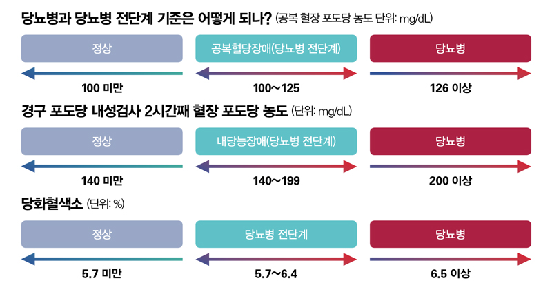 A 정상 혈당은 최소 8시간 공복 상태에서 100mg/dL 미만이고, 75g 포도당 내성검사 2시간째 혈장 포도당 농도는 140mg/dL 미만이다. 그런데 ❶공복 혈당 126mg/dL 이상 ❷75g 포도당 부하검사 2시간 후 혈당 200mg/dL 이상 ❸당화혈색소 6.5% 이상 ❹당뇨병의 전형적인 증상(오줌을 자주 누거나 물을 자주 마시거나 설명되지 않는 체중 감소)이 있을 때 혈당 200mg/dL 이상이 당뇨병이다. ❶~❸번은 서로 다른 날 검사를 반복해 확진하지만, 같은 날 두 가지 이상에서 기준을 충족하면 바로 진단할 수 있다.