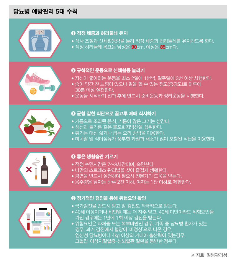 당뇨병을 조기에 발견하는 손쉬운 방법은 늦어도 40세부터는 매년 건강검진을 통해 혈당을 추적하는 일이다. 특히 비만하거나, 당뇨병 가족력이 있거나, 이전에 당뇨병 전단계 진단을 받았거나, 임신성 당뇨병 과거력이 있거나, 고혈압·이상지질혈증이 있는 사람은 나이와 상관없이 정기적으로 당뇨병 검사를 받아야 한다. 당뇨병 검사는 당뇨병을 확인하는 수단일 뿐이다. 당뇨병을 예방하거나 치료하기 위해서는 생활습관 개선이 절대적이다. 당뇨병의 다른 이름이 생활습관병일 정도로 당뇨병은 나쁜 생활습관이 오랜 기간 쌓인 결과물이기 때문이다. 지영미 질병관리청장은 "주요 만성질환을 공통으로 예방할 수 있는 예방관리 수칙 실천을 통해 당뇨병과 합병증을 예방하는 것이 중요하다"고 강조했다.