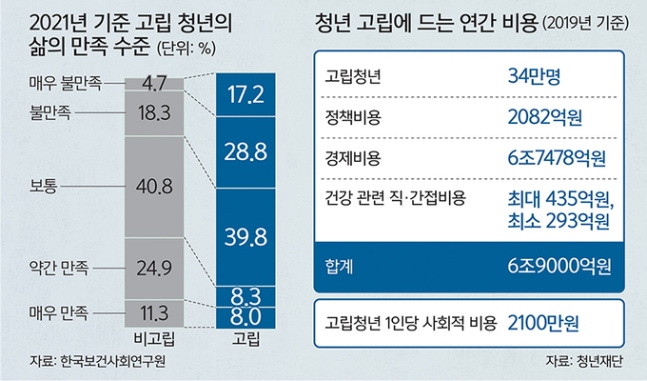 고립 청년은 고립되지 않은 청년에 비해 경제활동을 하지 않을 확률이 2.64배 높다는 연구결과도 있다. 이를 1인당 연평균 소득 3740만원, 비출산에 따른 손실비용 등을 더해 계산하면 연간 6조7478억원의 경제적 비용 손실을 보는 것으로 나타났다. 의료비용도 발생한다. 청년이 고립되면서 앓을 수 있는 우울증, 불안장애, 고혈압, 당뇨병 등으로 발생할 수 있는 직·간접적인 의료비용을 추산하면 연간 최대 435억원, 최소 293억원이 쓰일 수 있는 것으로 나타났다. 이를 모두 더하면 연간 6조9000억원의 비용이 발생한다.