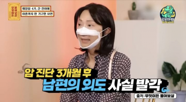 그는 자신이 암 진단을 받은 지 3주 뒤부터 남편이 외도를 시작한 것을 알게 됐다며 블랙박스, 메신저 등을 통해 증거를 수집했다. 상대 여성은 전남편이 운영하던 체육관원이었고 “상대 여성도 제가 암인 걸 다 알고 있었다”고 전했다.