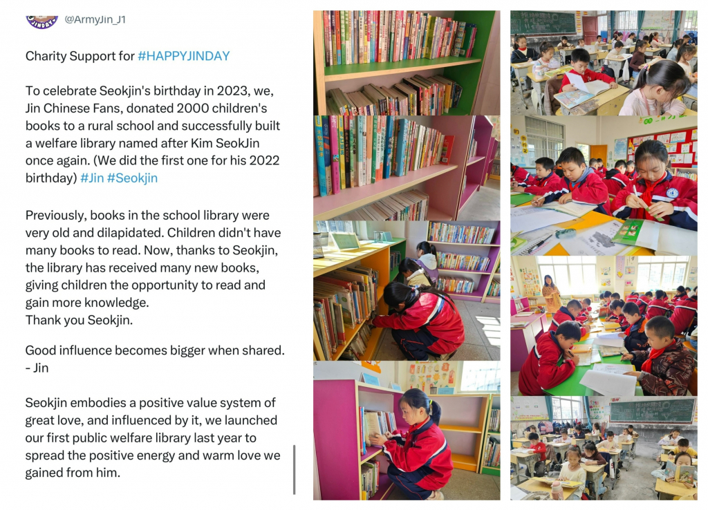'ArmyJin_J1'는 진의 생일을 맞아 뜻깊은 기부 활동을 실천한 바 있다. 농촌 지역 학생들을 위해 도서 2000권 이상을 시골 학교에 기증하고, 지난해 진의 본명 '김석진' 이름을 딴 복지 도서관에 이어 2년 연속 특별한 나눔을 했다.