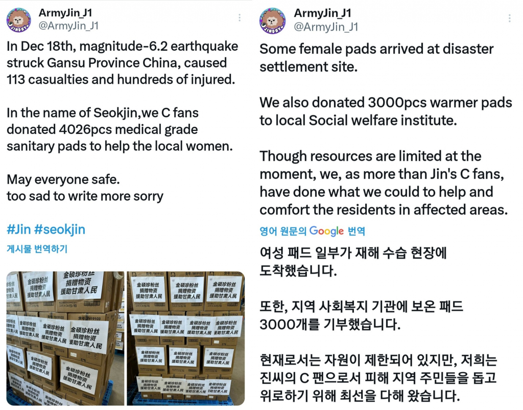 중국 팬베이스 'ArmyJin_J1'는 "최근 중국 간쑤성(Gansu)를 강타한 6.2 규모의 지진으로 지역 주민들이 많은 곤란을 겪고 있다"며 "그들이 처한 어려움에 공감한 방탄소년단 진 중국 팬베이스는 기본 필수용품의 부족을 예상하여 어려움에 부닥친 이 지역의 여성들을 지원하기 위해 4,026개의 여성 위생용품을 기부했다"고 따뜻한 마음을 전했다.