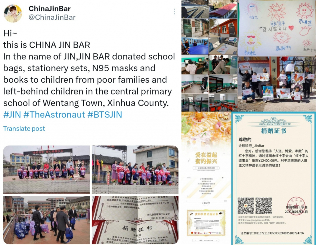 또 다른 진의 중국 팬베이스 '차이나 진 바(CHINA JIN BAR)'는 지난 2021년 중국 허난성(河南成)의 홍수로 어려움을 겪고 있는 주민들을 위해 정저우시(Zhengzhou) 적십자에 1만 2400위안(한화 약 220만원)을 기부한 바 있다.