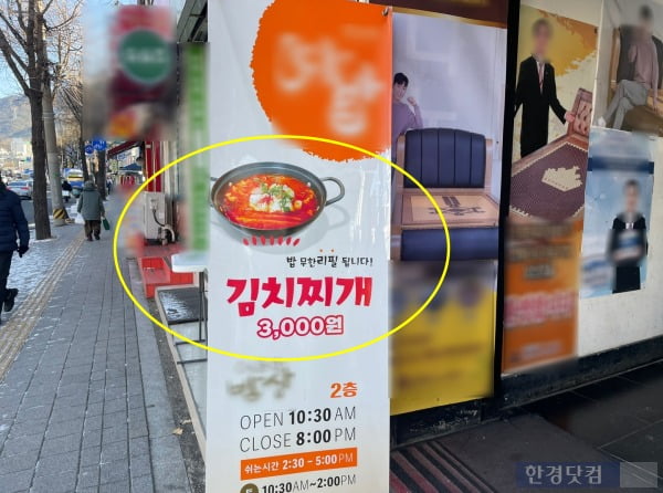 서울 은평구에서 '3000원 김치찌개'를 내놓은 한 식당의 입간판. /사진=김세린 기자