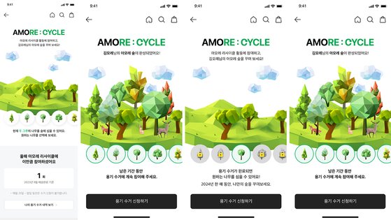 아모레리사이클 서비스를 이용한 뒤, 아모레 몰 앱에서 나만의 숲을 꾸밀 수 있다. 사진 아모레퍼시픽