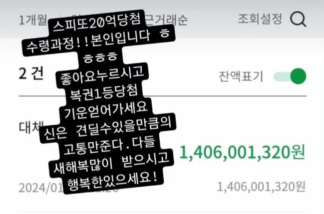 그는 “SNS에 올리는 사람 처음 봤다는데 뭐 세상에 더 많은 돈을 가진 분들이 계시니”라며 당첨 사실을 공개한 이유를 밝혔다. 그러면서 “열심히 살자. 없는 돈이라 생각하고”라고 적기도 했다. A씨는 당첨금이 들어온 통장도 함께 인증했다. 통장에는 20억원 당첨금에서 세금을 제외한 금액인 14억600만원이 찍혀있었다.
