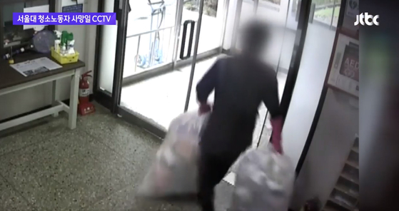 JTBC는 2021년 7월 청소노동자 이모씨가 숨진 당일 CCTV 영상을 입수해 보도했습니다. 이씨가 엘리베이터도 없는 5층 기숙사 건물의 쓰레기를 수거하는 모습이 담겨있었습니다.