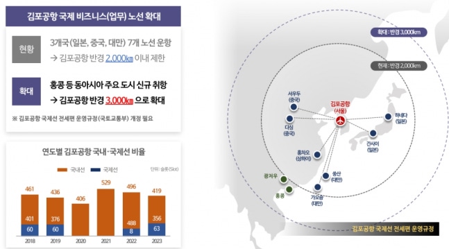 김포공항의 '운항 규제'부터 풀어 동북아권 핵심 공항으로 역할을 확대한다. 현재 수도권 제2 공항인 김포공항은 인천공항 허브화 정책 등 정부의 운항 제한 규제에 묶여 2000㎞ 이상 취항이 불가능하다. 역내 2000㎞ 안에 약 50개의 대도시가 있지만, 인천공항 허브화 정책 탓에 사실상 신규 취항이 제한적이다. 시는 김포공항 국제선 전세편 운영규정(국토교통부)을 3000㎞까지 확대해 동아시아 주요 도시와의 업무 교류를 확대할 계획이다. 이를 위해 국토부 등 중앙정부에 규정 개정을 적극적으로 건의할 예정이다.