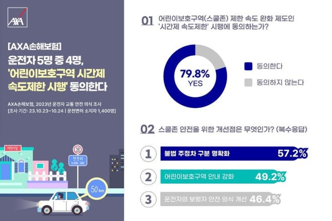 AXA손해보험이 25일 만 19세 이상 운전면허 소지자 1400명을 대상으로 '2023 운전자 교통안전 의식 조사'를 실시한 결과, 스쿨존 시간제 속도제한에 동의한다는 의견이 79.8%인 것으로 나타났습니다.