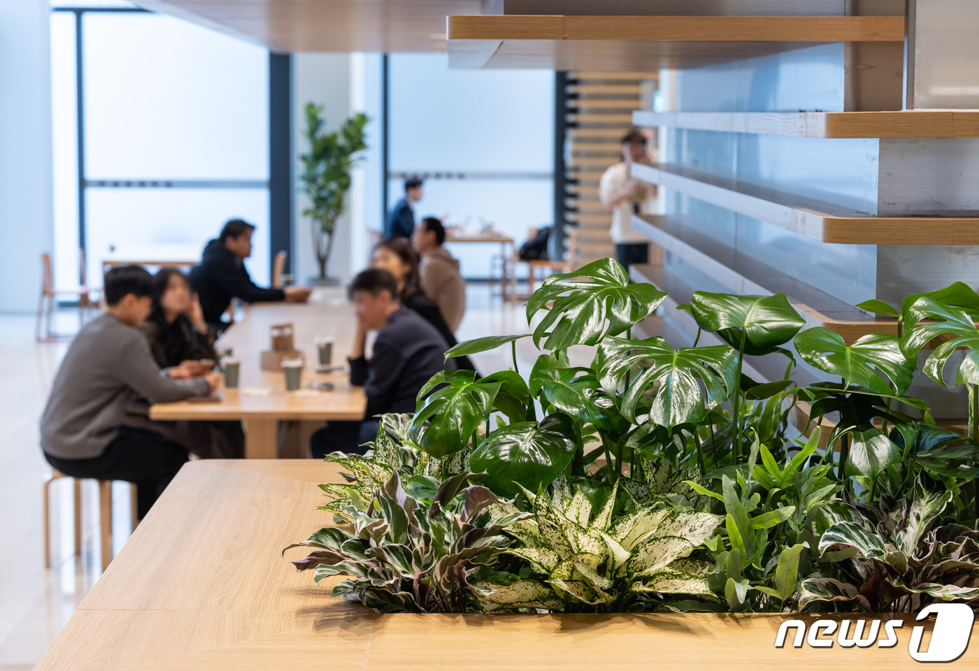 LG트윈타워가 1987년 완공 후 처음으로 저층부 공용공간 리모델을 마치고 1일 새롭게 태어났다. 지하 1층 카페 공간에서 직원들이 휴식하고 있는 모습. 2024.4.1/뉴스1 ⓒ News1 이재명 기자