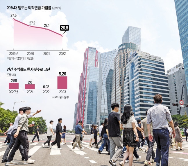 문제는 적립금 납입 부담 등을 우려해 많은 기업이 퇴직연금 도입을 주저한다는 점이다. 2022년 말 퇴직연금 가입 사업장은 전체의 26.8%에 불과하다.